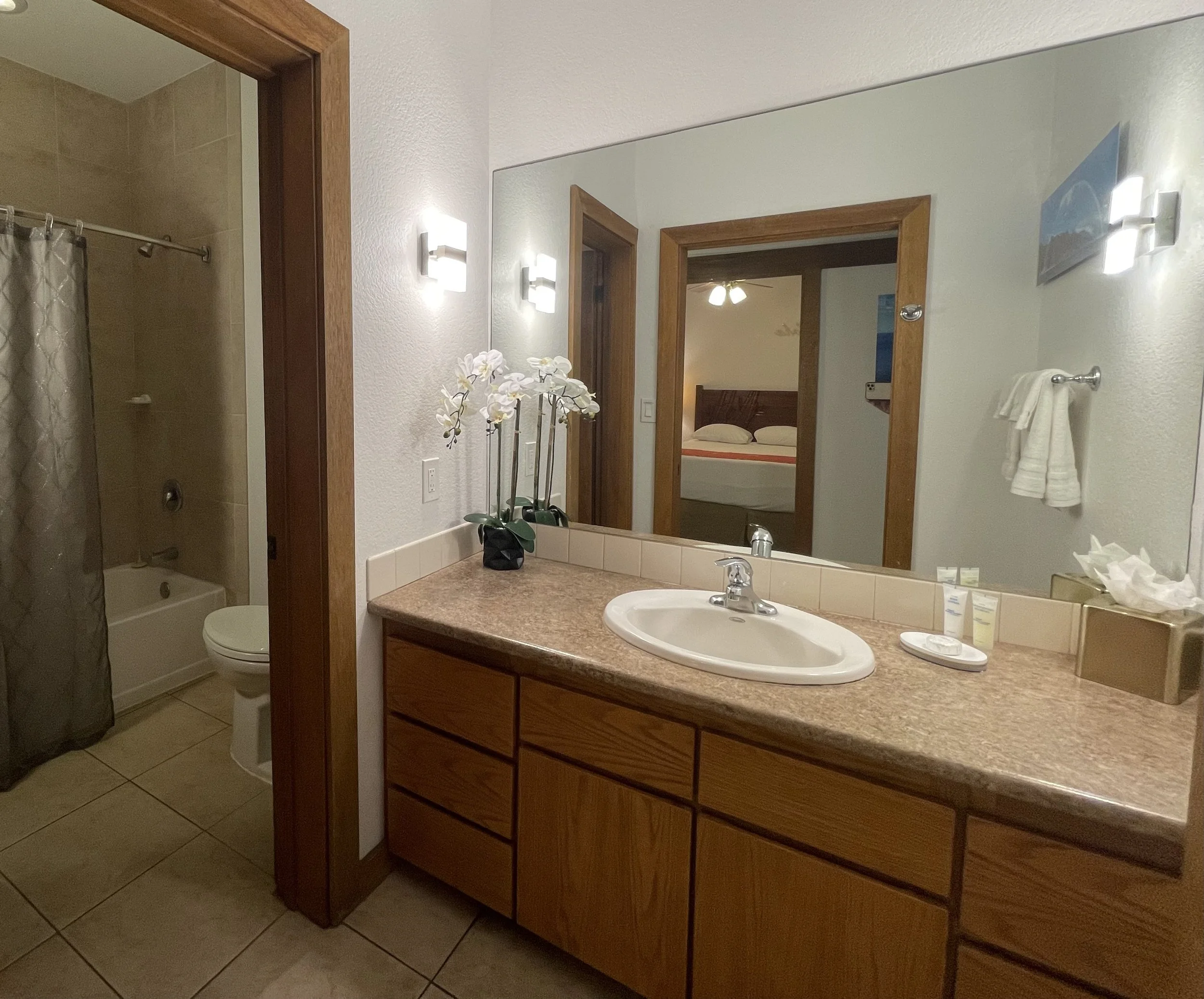 • The bathroom has a single vanity and shower. I provide the basics-soap, shampoo and conditioner